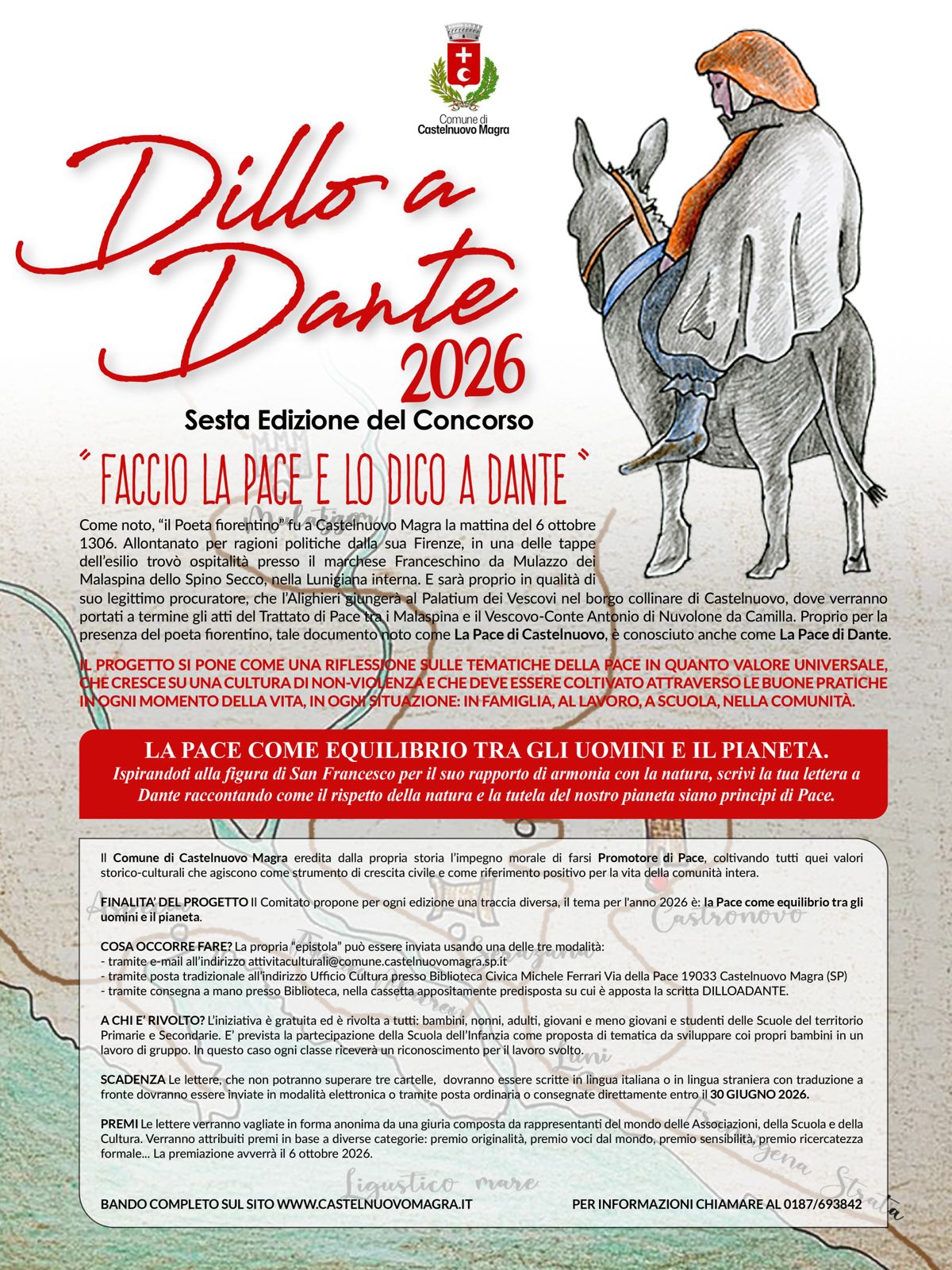 In occasione del Dantedì, la Giornata nazionale dedicata a Dante Alighieri, il Comune di Castelnuovo Magra invita la cittadinanza alla presentazione della VI edizione del concorso epistolare "Dillo a Dante".