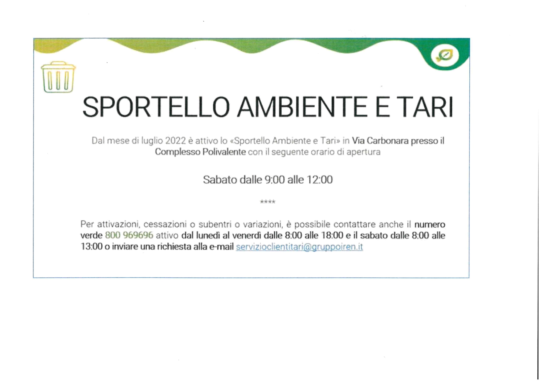 Per la denuncia di occupazione/variazione/cessazione era necessario compilare e sottoscrivere la modulistica presente presso l’ufficio tributi e nel presente sito e per le attivazioni, le cessazioni, i subentri e le variazioni ai fini TARI dal 1° di luglio 2022 era attivo lo SPORTELLO AMBIENTE E TARI in Via Carbonara presso il Complesso Polivalente il sabato mattina dalle 9:00 alle 12:00.