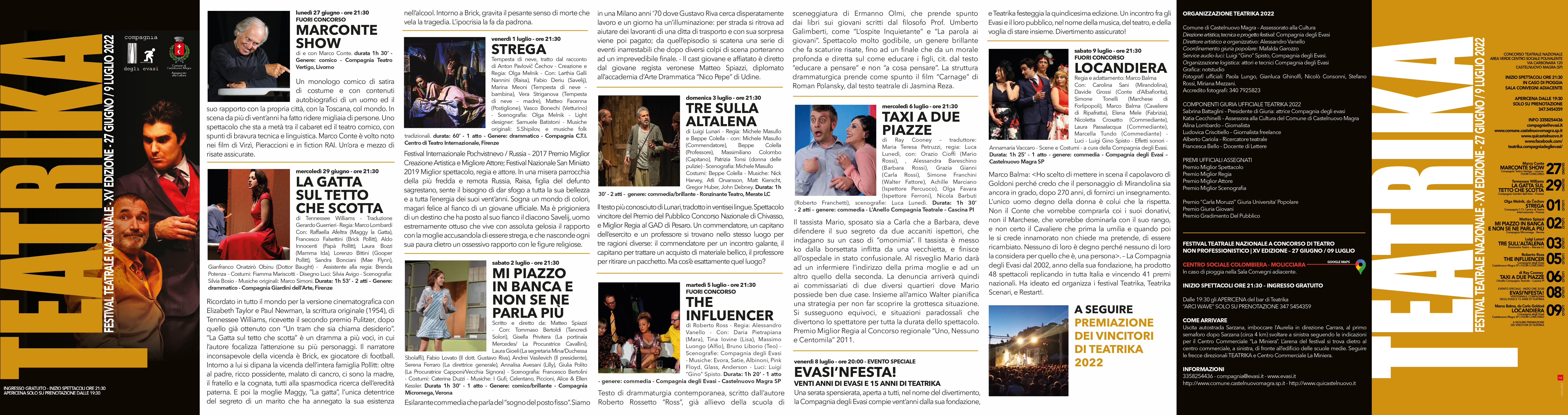 Il festival, frutto della sinergia tra la Compagnia degli Evasi ed il Comune di Castelnuovo Magra, si terrà come da tradizione nell’arena teatro dell’area verde del centro sociale di Molicciara in via Carbonara 120. Tutti gli spettacoli iniziano alle 21.30, anche in caso di pioggia, e sempre ad ingresso gratuito.