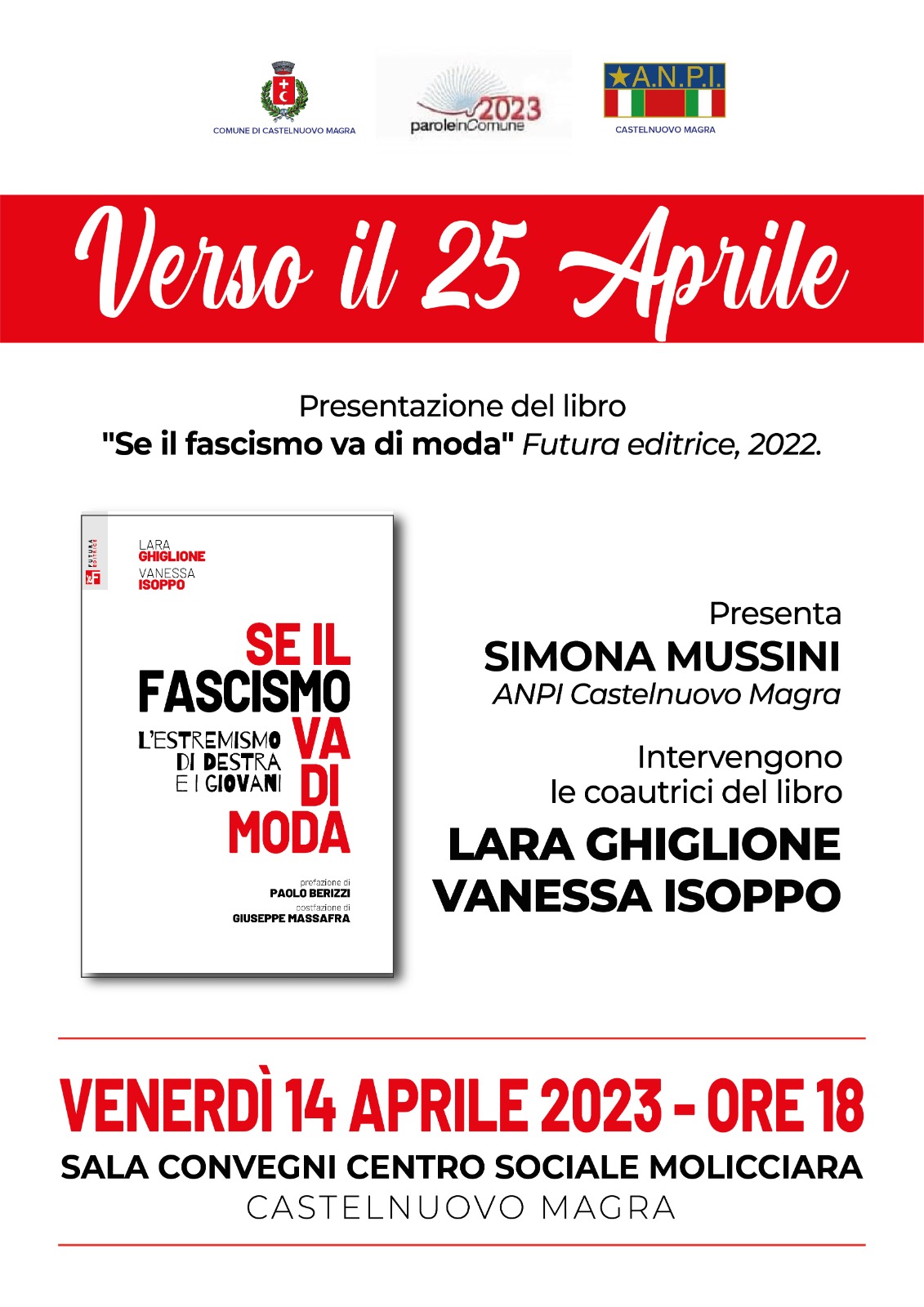 In preparazione della celebrazione per la Festa della Liberazione, venerdì 14 aprile, alle ore 18, nella Sala convegni del Centro sociale di Molicciara verrà presentato il libro "Se il fascismo va di moda. L’estremismo di destra ed i giovani” (Futura editrice 2022) con la partecipazione delle due autrici: Lara Ghiglione, Coordinatrice Segreteria Generale e responsabile politiche di genere CGIL nazionale, e Vanessa Isoppo, psicologa-psicoterapeuta specializzata in Psicoterapia dell'approccio centrato sulla persona, già docente di Psicologia Generale all'Università di Genova, specializzata inoltre in Problemi e Patologie Alcol-correlate e Scienze Criminologico-Forensi, nata a Sarzana, vive e lavora a Roma.